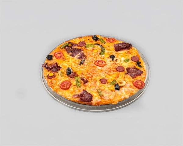 Pizza hamuru, özel pizza sosu, mozarella peyniri, sucuk, sosis, pastırma, mısır, dilimli zeytin, domates ve biber ile hazırlanır.