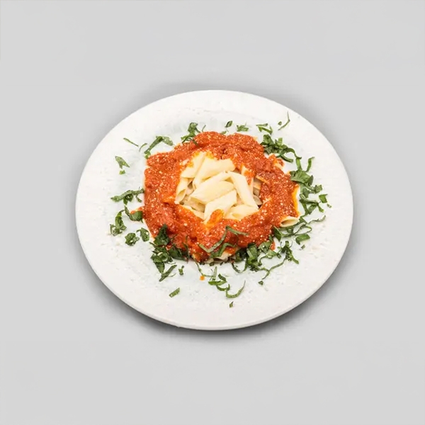 Barilla penne makarna, özel arrabbiata sos, fesleğen ve toz parmesan eşliğinde servis edilir.