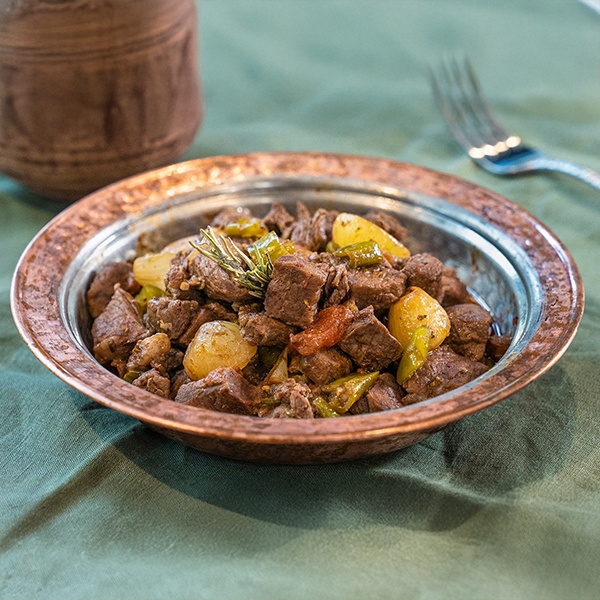 Dana pöçten yapılır. Güveçte pişmiştir. Yoğurtlu köz patlıcan ezme, salata, domates, biber ve pide ile servis edilir.