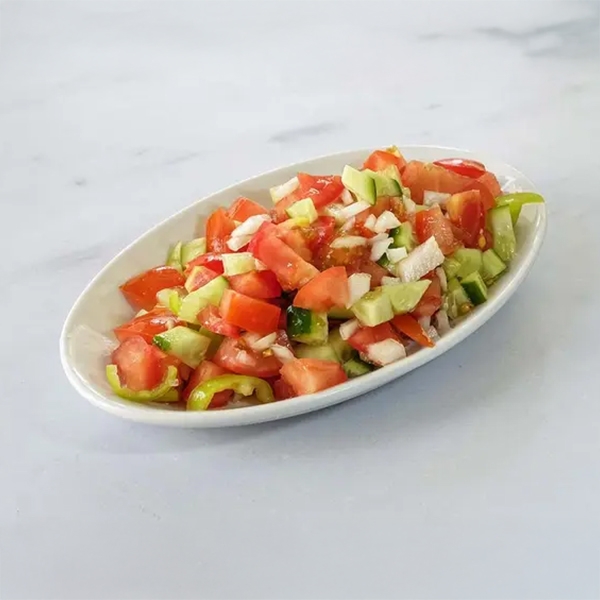 Domates, salatalık, biber, taze soğan, kırmızı soğan, maydanoz, sızma zeytinyağı, sıkma limon ve arzuya göre beyaz peynir eşliğinde servis edilir.